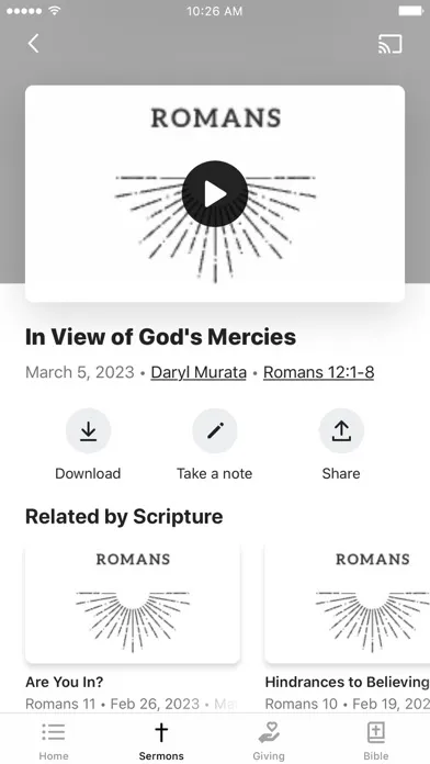 This app will help you stay connected with the day-to-day life of our church. With this app you can: watch or listen to past messages; stay up to date with push notifications; share your favorite messages via Twitter, Facebook, or email; and download messages for offline listening.