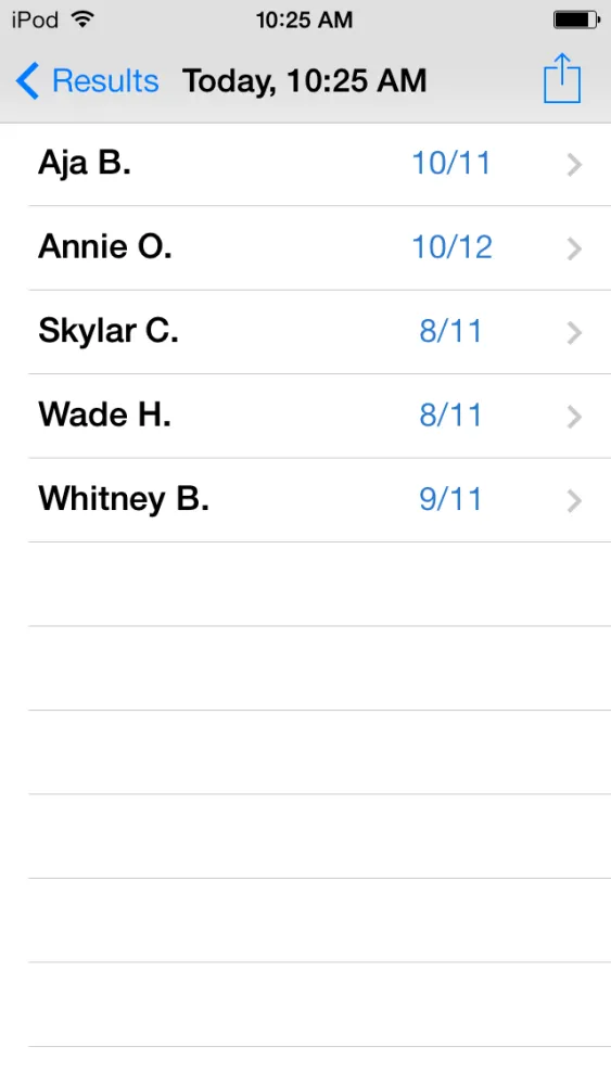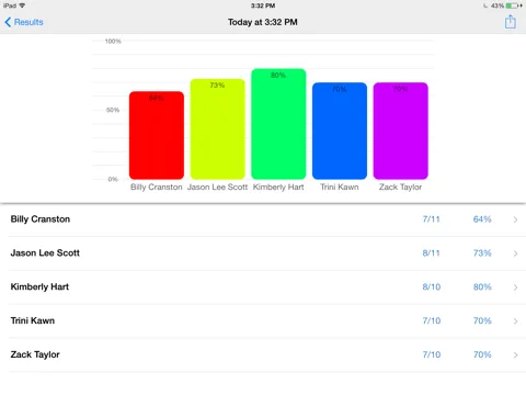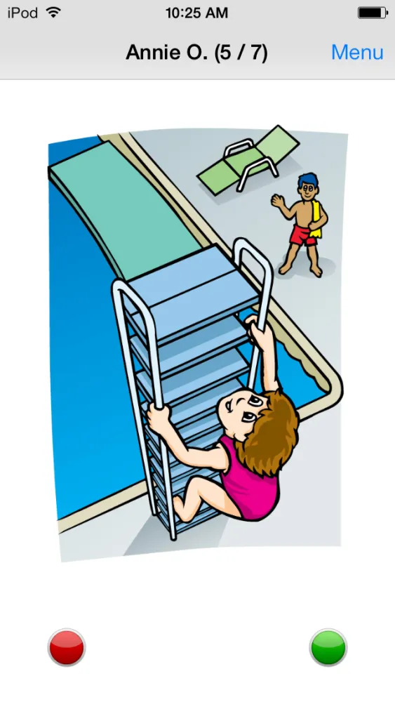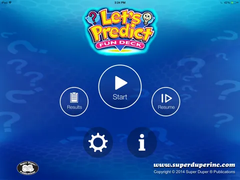 This App is simple to use — each student looks at an illustration, and either reads the prompt or touches the screen to listen to the prompt. The student then gives a verbal response. After each answer, tap the green (correct) or red (incorrect) button to score the student’s verbal response. Move to the next card by sliding the card currently on the display screen to the side. To move to the next player, tap the bar at the top of the screen and select a name. You can also advance cards and players automatically by selecting the Auto-Advance option in the Game Options menu. You can leave a game temporarily and return to it later by selecting Pause Game from the menu. To return to the game, select Continue Game from the main menu. When you finish, view the results in a graph, and print or email your data.