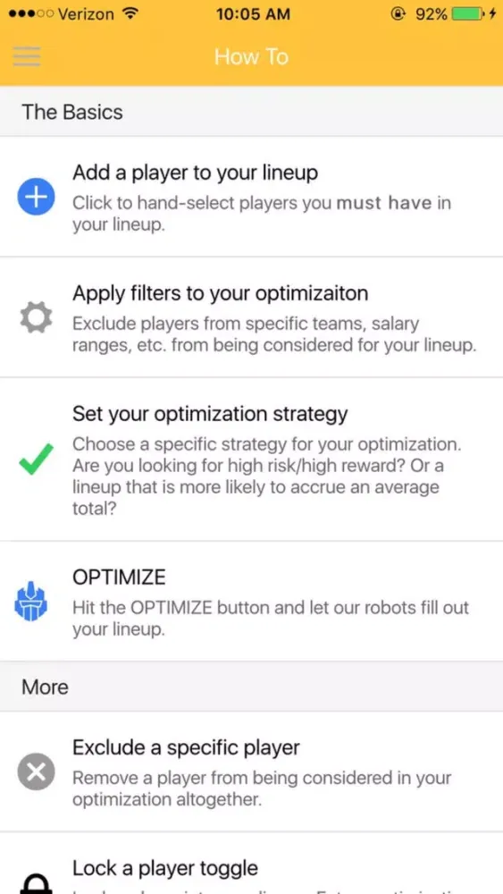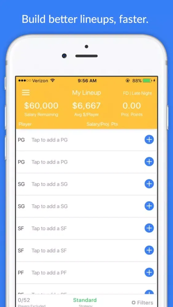 With accurate projections, analysis and data powered by the same advanced technology trusted by professional daily fantasy sports players, it's never been easier to build and optimize your perfect DraftKings, FanDuel and Yahoo lineups on the go so you never have to miss a contest.