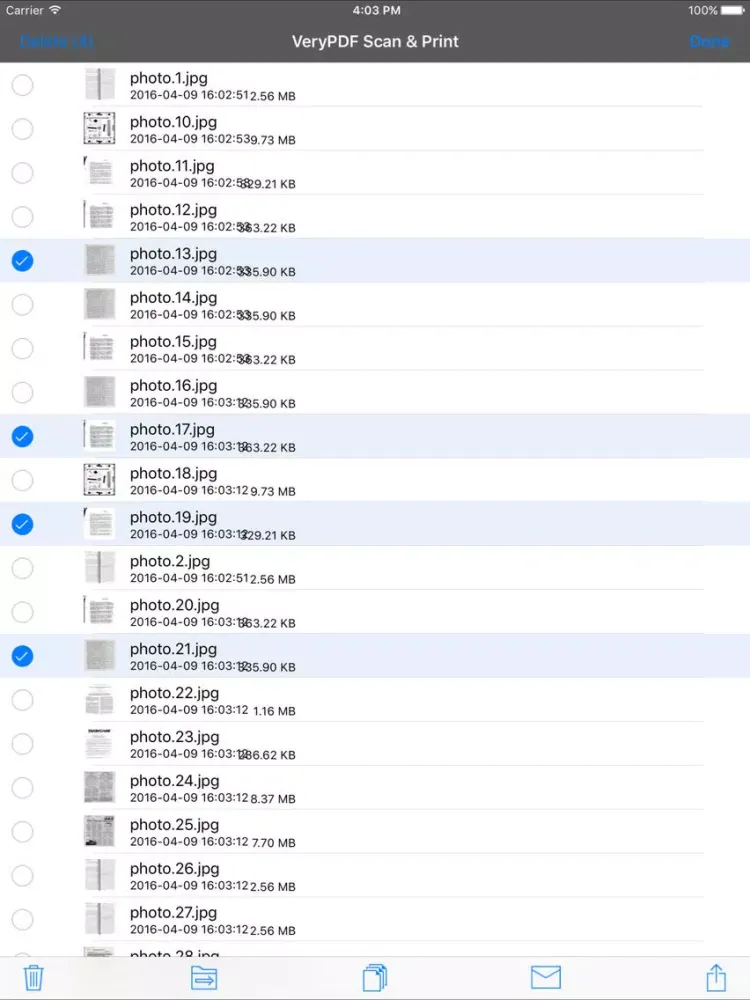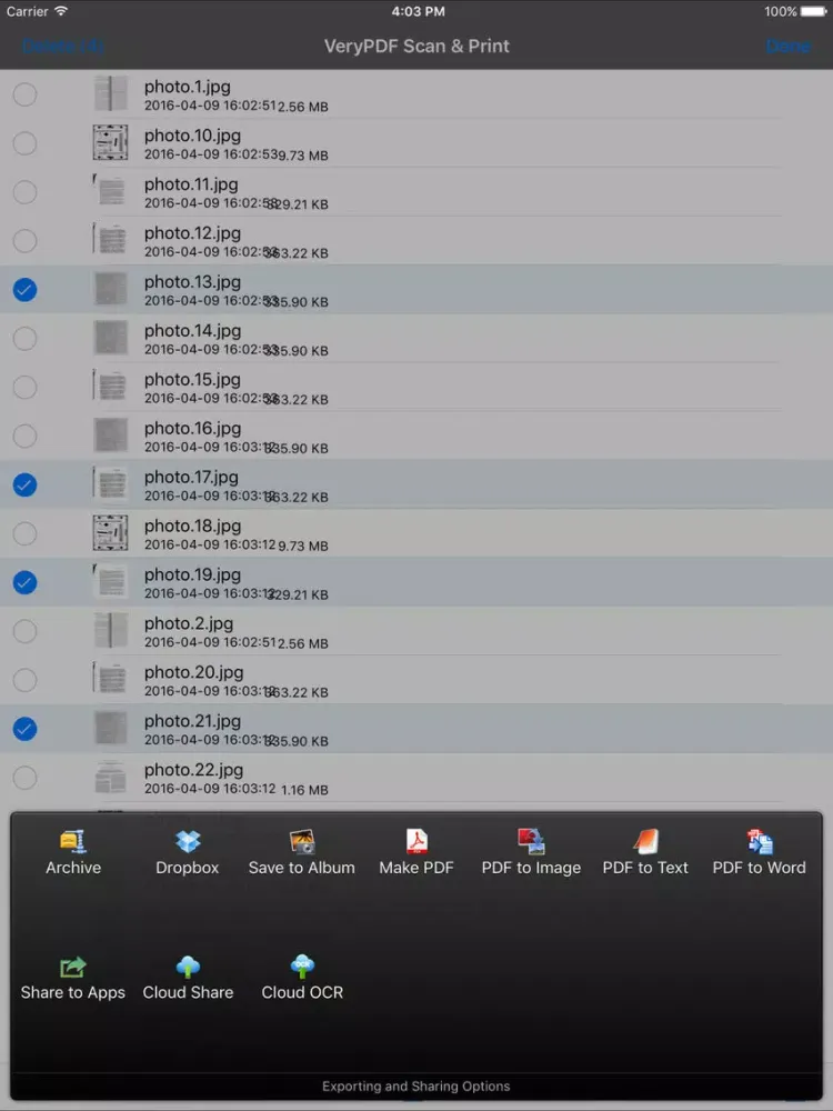 - All scans are saved as JPEG files and can be exported as PDF files from selected pages.