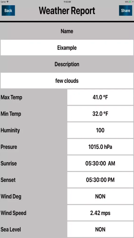 - Weather info like raining status, temperature min, max in degrees and Fahrenheit and wind speed details.