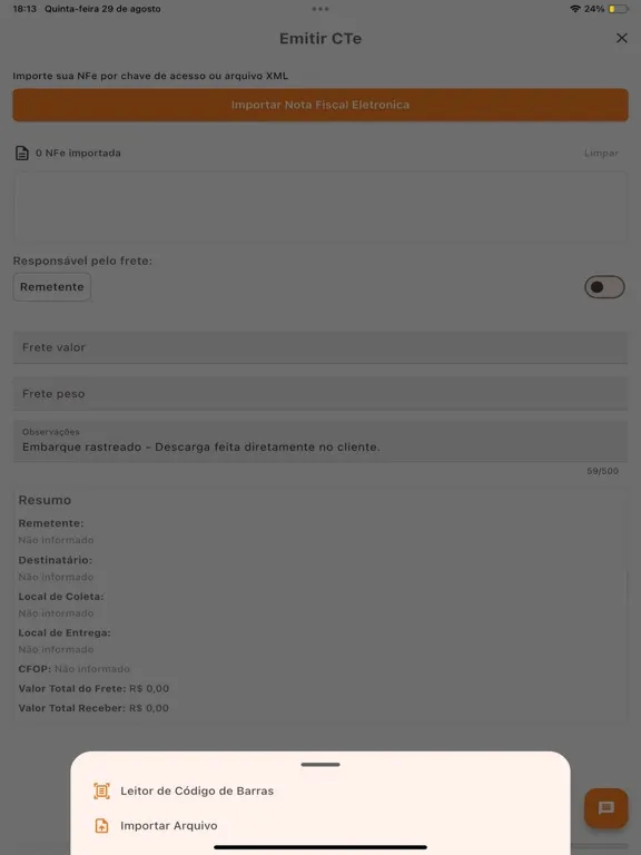 Nosso aplicativo simplifica a rotina dos motoristas, permitindo que eles foquem no que realmente importa. É possível emitir documentos de qualquer lugar, basta o motorista ter um celular com acesso à internet.