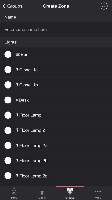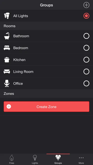 Select one or more lights for your fire light show on the Lights/Groups tab. Choose a group that you set up using the Philips Hue app, or create a new zone in the Firestorm for Hue app. To edit a zone in the list, swipe the item to the left and tap the pencil icon. When you add, remove, or change lights, pull down the list to refresh.
