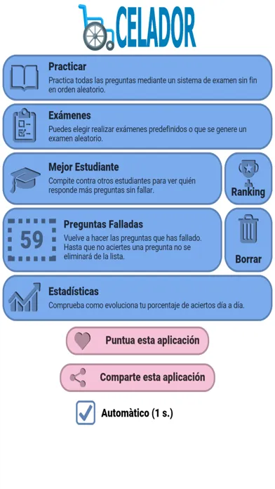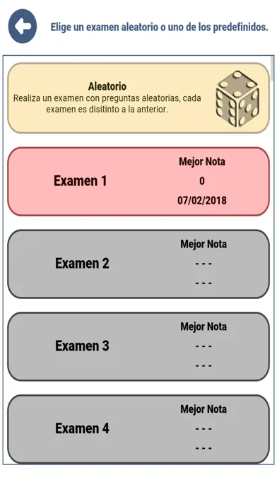 La aplicación tiene las casi 5000 preguntas recopiladas de exámenes reales de años anteriores. Tienes varios modos de aprendizaje: