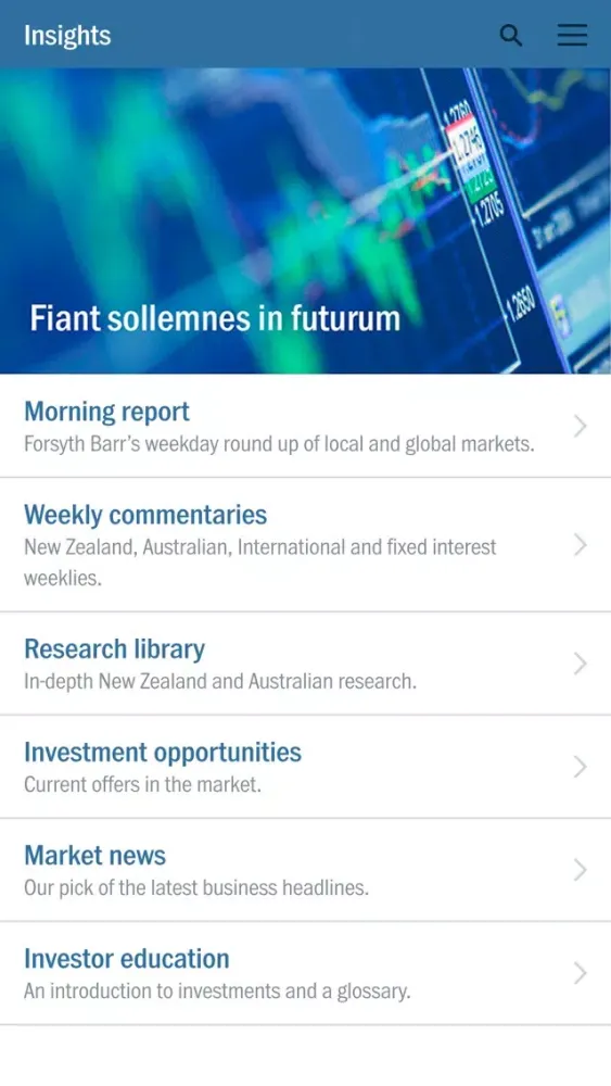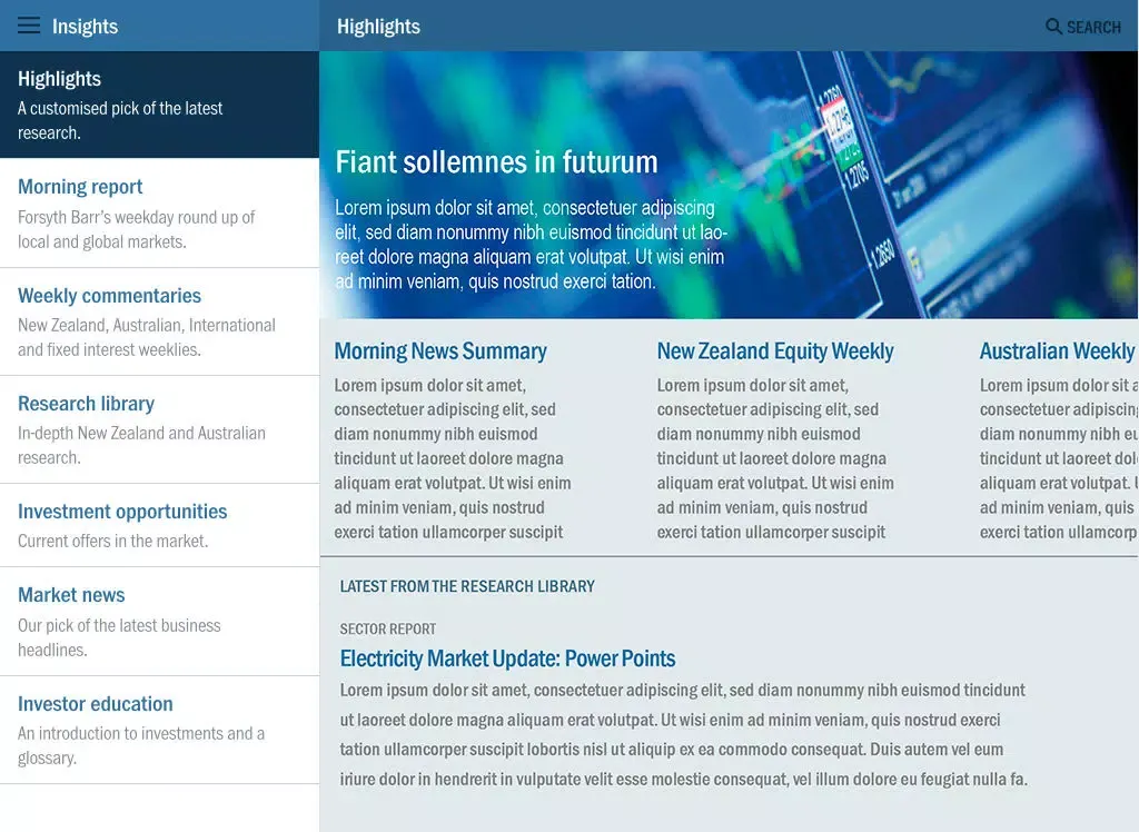 Forsyth Barr Investment Insights app lets you check your Forsyth Barr investment account, create and monitor a watchlist of NZX and ASX securities, follow market news and read a morning news summary.