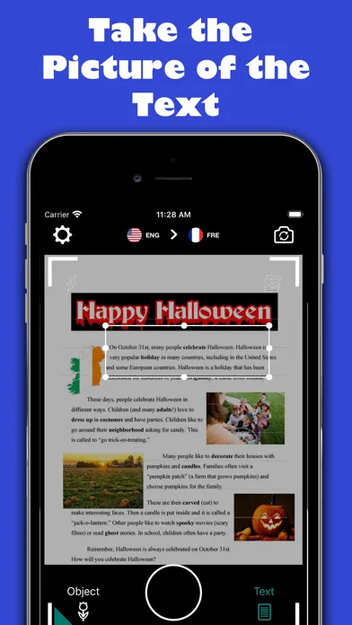 Take a photo of any object with text on it or select a photo from your gallery. The app will scan the text and translate it into any language.