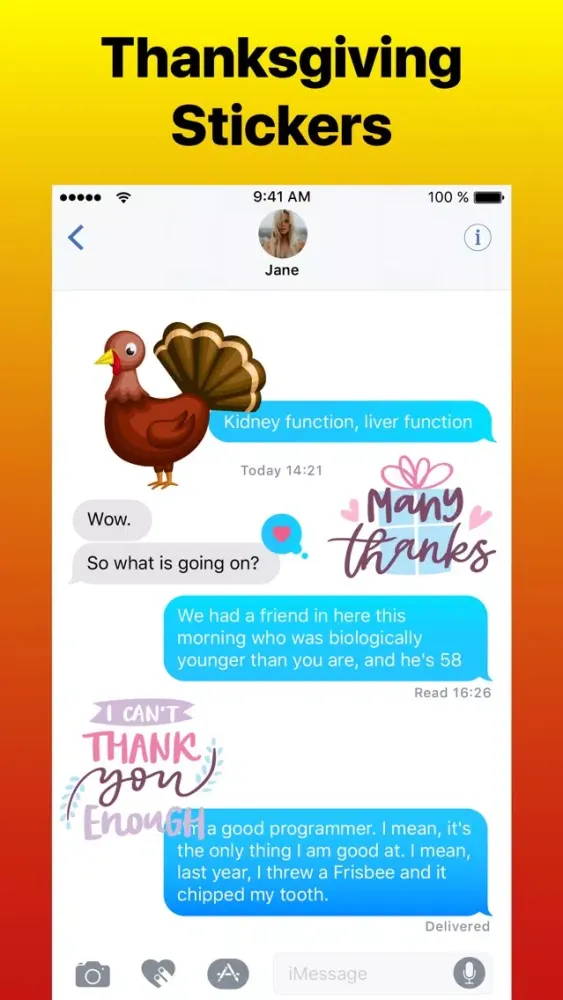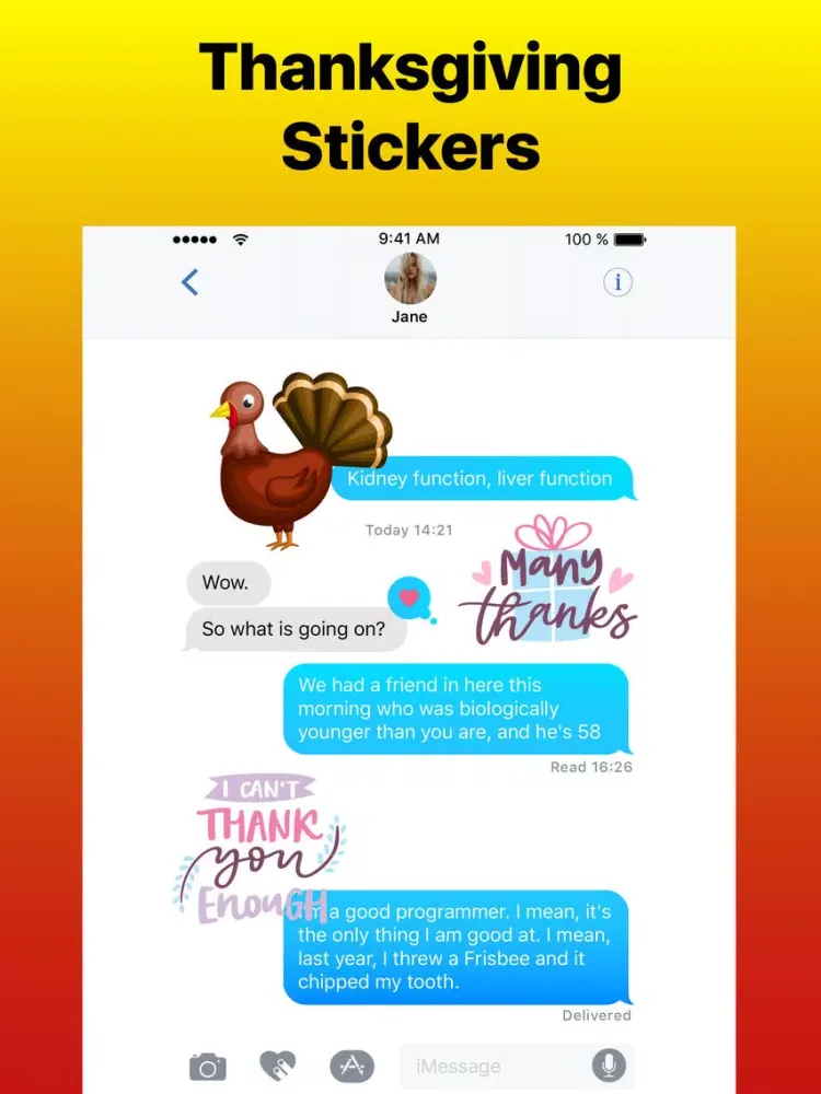 Celebrate the Thanksgiving party with your friends & family with these amazing stickers. Featuring Turkey & Quotes stickers. Everyone is going to love this for Thanksgiving. These stickers are unique & a conversation starter inside a iMessage Chat!
