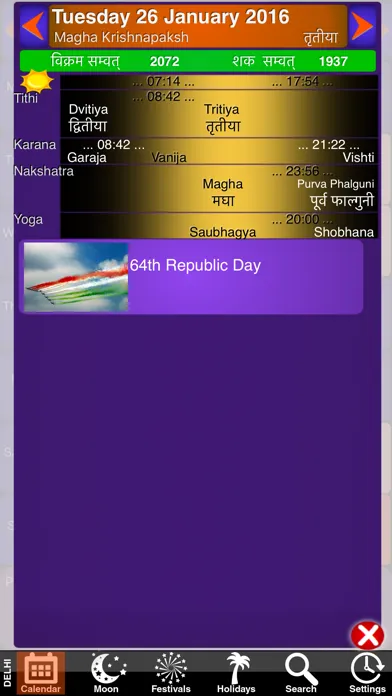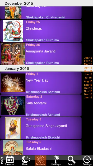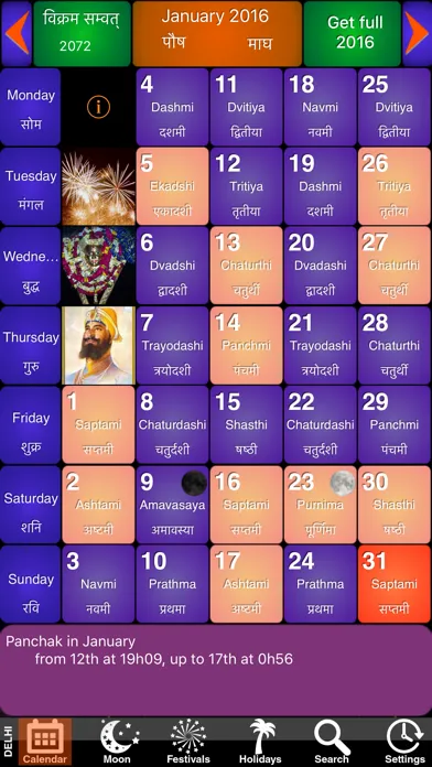 For every year, our panchang contains more than 340 important date of events and holy festivals in India. It reflects India's culture through the Hindu, Muslim, Sikh, Christian and civil festivals happening all along the year. Nearly all the festivals are illustrated with a colorful image.
