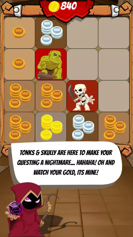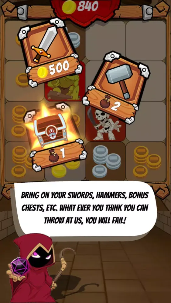 Earn gold to slay monsters, combine monsters to save gold, open treasure chests for the possibility to earn swords or hammer to help you through the game!