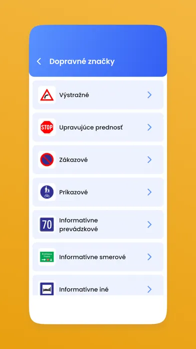 Dopravné značky – appka obsahuje kompletný zoznam všetkých značiek, roztriedených do jednotlivých kategórií. Nájdete v nej všetky značky, ktoré vám robia problém a navždy si ich zapamätáte.