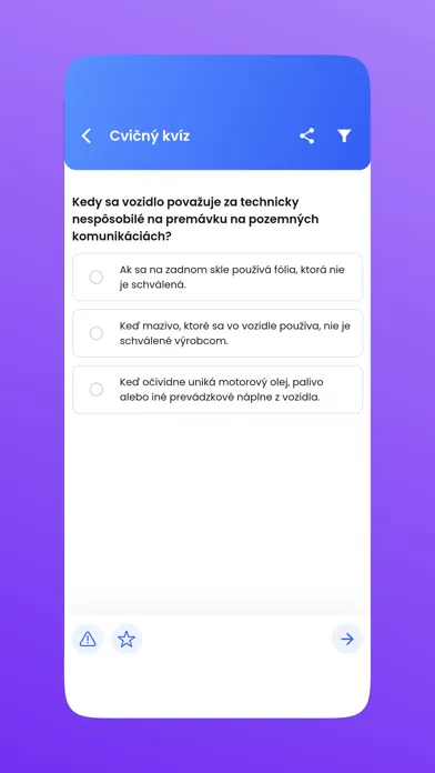Testy z autoškoly – aplikácia disponuje najnovšími a pravidelne aktualizovanými testami, ktorými si môžete pravidelne preskúšavať svoje vedomosti z cestnej premávky.