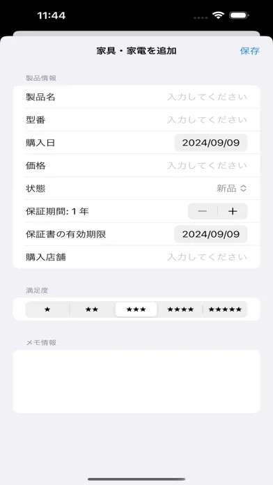 ●簡単登録:家具や家電の情報を簡単に登録。製品名、型番、購入日、価格、状態(新品・中古)、保証期間、保証書の有効期限、購入店舗、満足度、メモ情報を記録/保存できます。