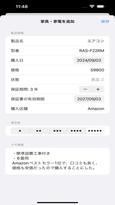 購入日や価格、保証期間、満足度などの情報を一元管理し、いつでもどこでも簡単にアクセス可能です。