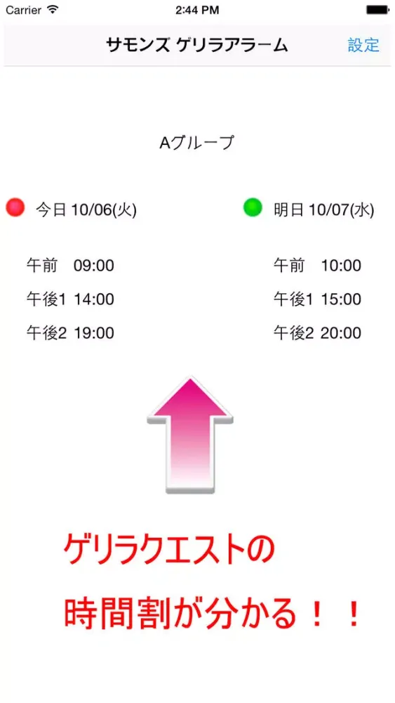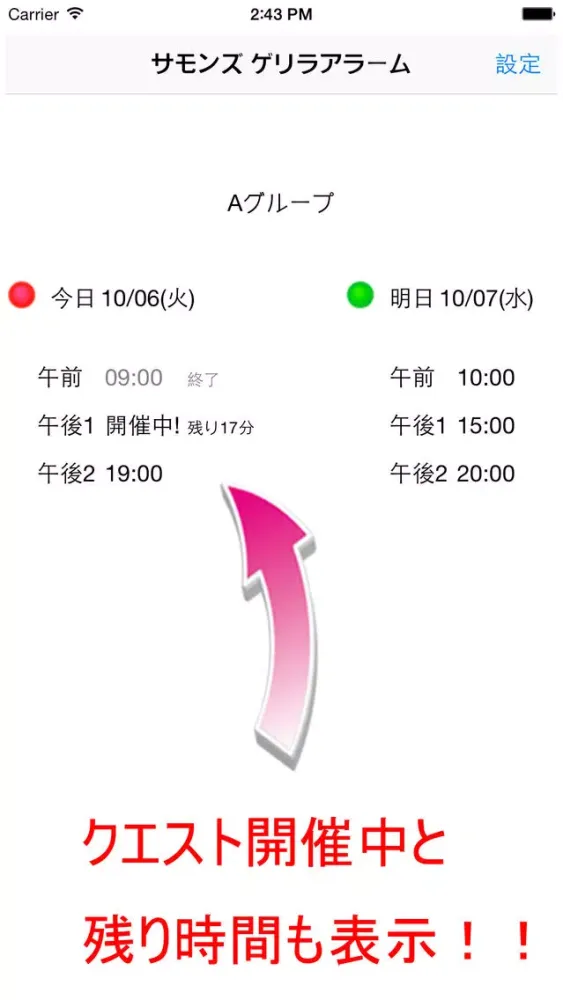 今日と明日のゲリラクエストの時間と属性が画面表示され、開始時間をアラームでお知らせしてくれます。