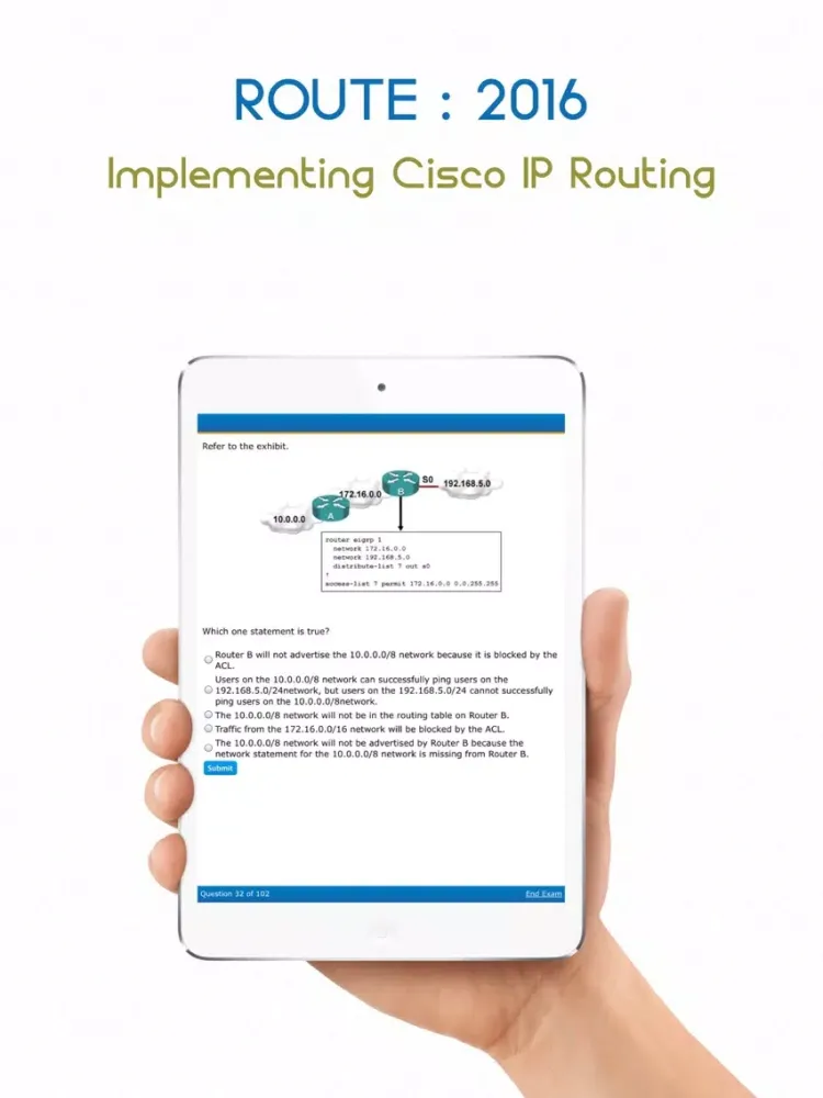 Implementing Cisco IP Routing (ROUTE 300-101) is a 120-minute qualifying exam with 50‒60 questions for the Cisco CCNP Routing and Switching and CCDP certifications. The ROUTE 300-101 exam certifies the routing knowledge and skills of successful candidates. They are certified in using advanced IP addressing and routing in implementing scalable and highly secure Cisco routers that are connected to LANs, WANs, and IPv6.