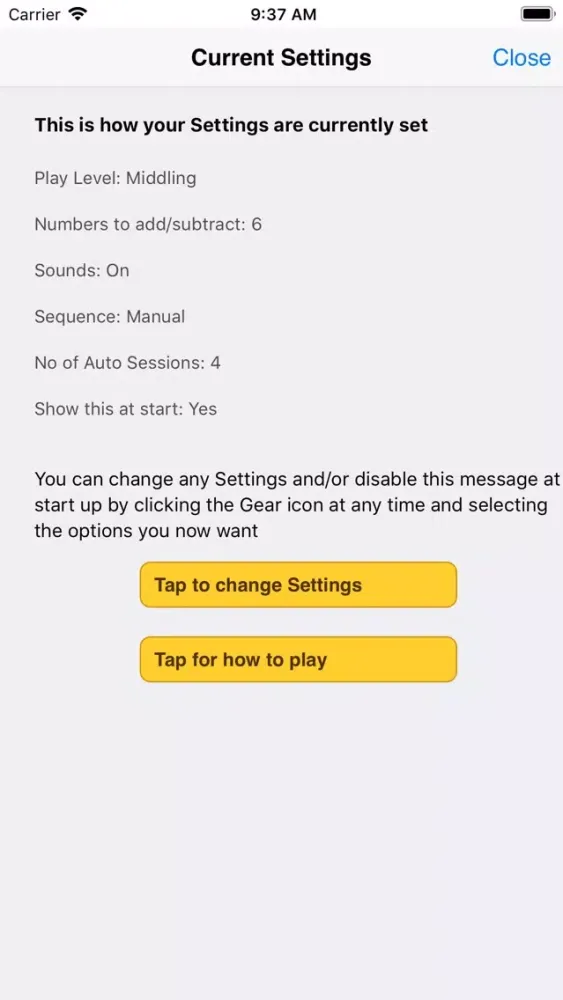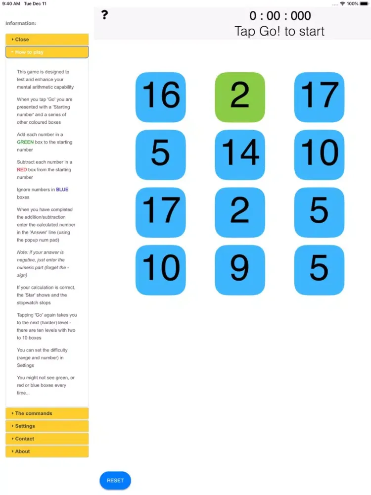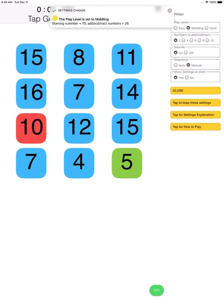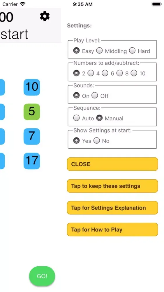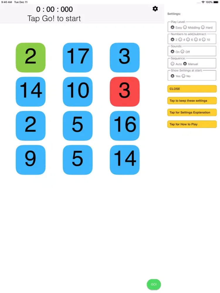 BrainExercise provides multiple levels (Easy, Middling and Hard) each with a choice of 2, 4, 6, 8 or 10 numbers to add/subtract; you can also select one puzzle at a time or a sequence with the clock running until all are solved. The scale of starting and add/subtract numbers is set by the chosen level (the starting and add/subtract numbers are from a larger range as the level is increased).