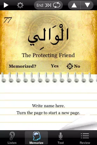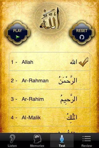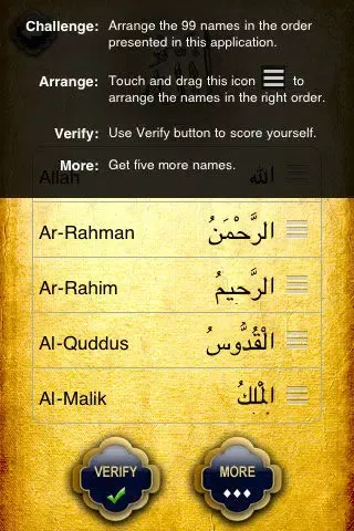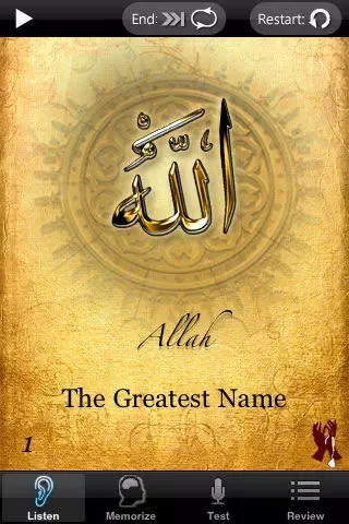 The Divine Names application provides the following features to help the user memorize the 99 names of Allah.