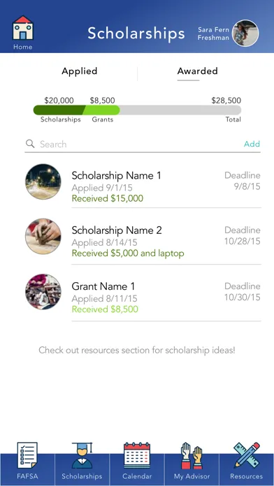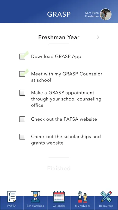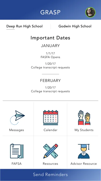 The GRASP App provides financial aid resources such as the FAFSA website, scholarship websites, financial aid events, and helpful videos. The app also has a messaging capability that enables students/parents to contact the GRASP advisors at their respective high schools regarding the financial aid process and financial aid requirements.