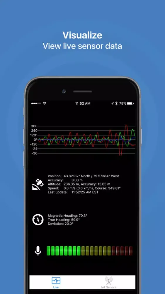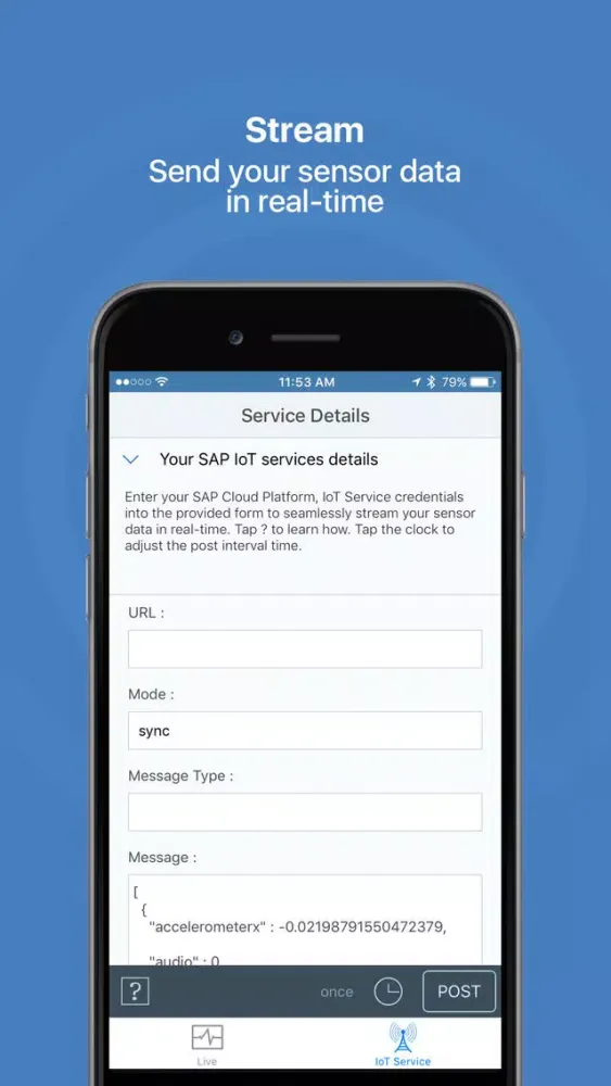 SensorPhone is an iOS client that allows you to visualize your iPhone’s sensor data in real-time. SensorPhone allows you to stream this sensor data to the Internet of Things services within the SAP Cloud Platform (via HTTP POST), intended for rapid IoT prototyping.