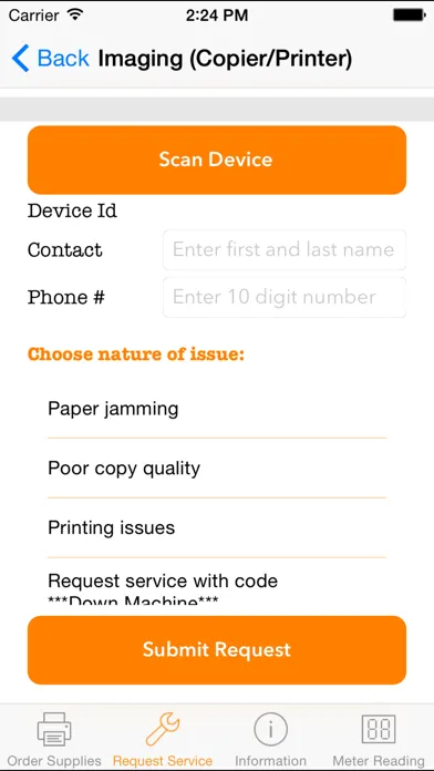This application allows you to scan the equipment ID tag barcode from your phone or mobile device. This action automatically populates all logistics information into a simple submission form and you can complete your supply or service request or enter your meter reads to send directly from your device.