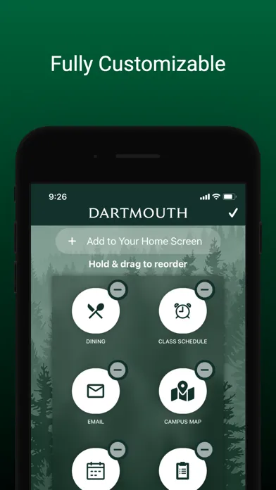 Your Dartmouth app is fully customizable by you: Rearrange your portals to easily access whichever features you use most. If you want to check Foco hours frequently, you can put the dining portal front and center. If you never check the directory, you can turn that portal off.