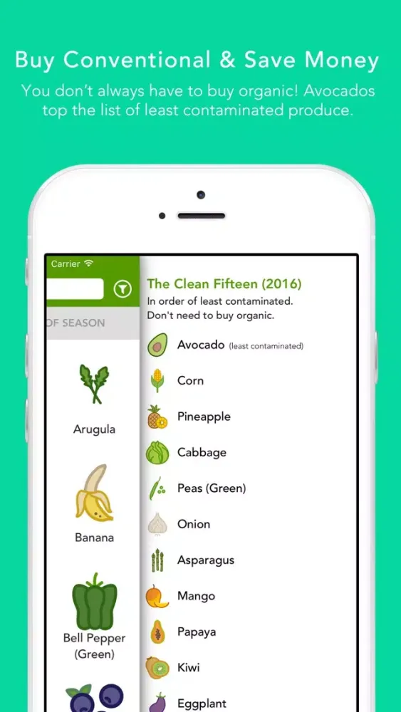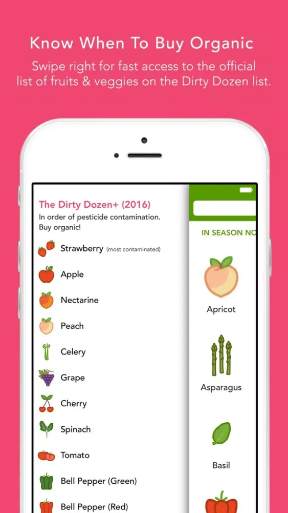 And by swiping left, you have access to the "Clean Fifteen": the food with the lowest pesticide residue and are the safest conventionally grown crops to consume. Save yourself some money by not having to buy organic!
