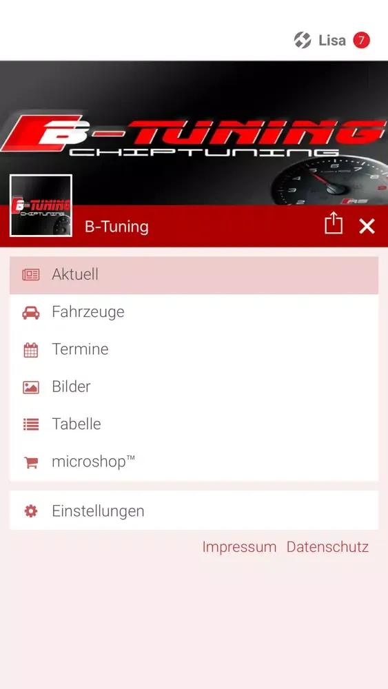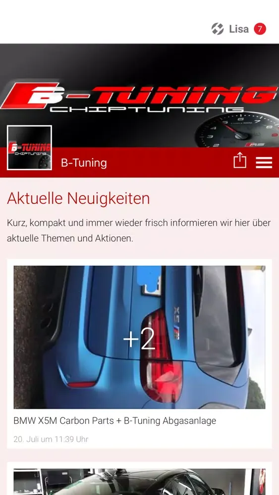 B-Tuning gibt es jetzt auch auf dem Smartphone! An jedem Ort der Welt über Neuigkeiten, Fotos, Termine und Veranstaltungen Bescheid wissen. Mit unserem App. halten wir sie mit News- und Trend`s auf dem Laufendem. Über das Tab Aktuelles informieren wir euch über Aktuelle Themen und sie können mit dem App. mit uns jederzeit mit integriertem Chat System Nachrichten Senden.