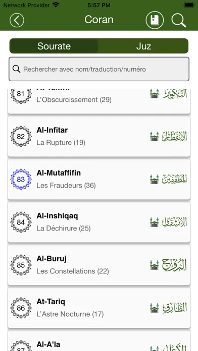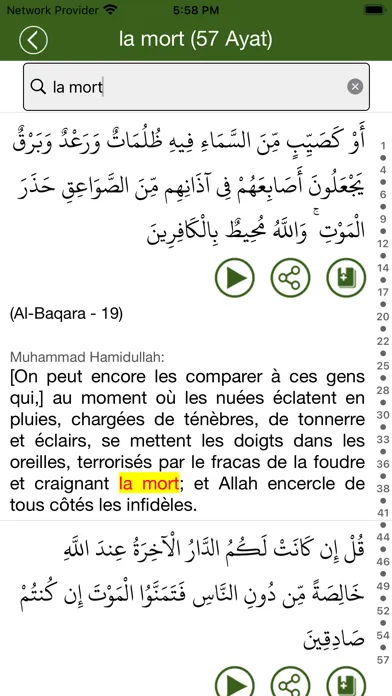 With this Islamic book app, you are getting Hafizi quran with real page-curl experience. This is not just a textual app, it is an audio Quran app. You can listen telwat of Quran ayats continuously (internet connection required). You can search words or topic in French on this Quran app. Bookmark the ayat / verse you like / quote. Share the ayat / verse you want.
