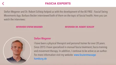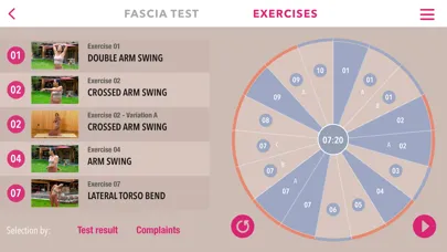 The fascial swing movements can be acquired by in-app sales. Get your individual training mix according to the test results. It consists of exercises for your imbalances and further swing movements that help you in maintaining your fascial health and fitness. Alternatively, you can have the workout designed according to your limitations or complaints, such as headaches or neck pain. The workout takes round about 10 minutes and can be done anywhere.