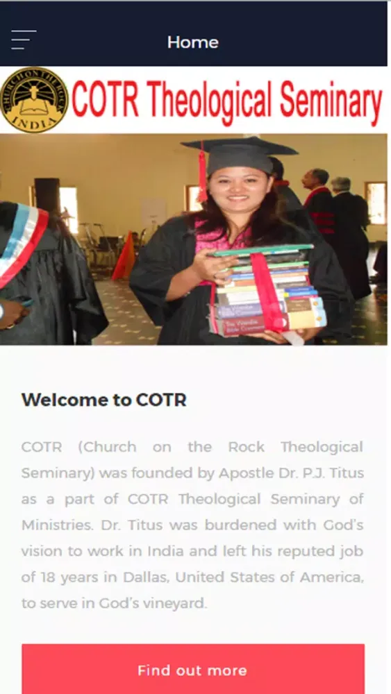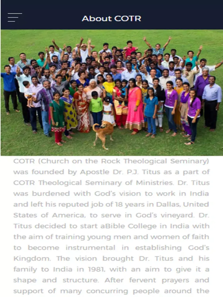 COTR (Church on the Rock Theological Seminary) was founded by Apostle Dr. P.J. Titus as a part of COTR Theological Seminary of Ministries.