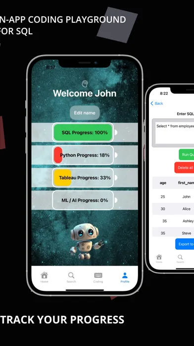 * In-App coding: write and run code in SQL on the go within the app in our coding playground, and improve your coding skills, with the ability to export query results to Excel and to save it on your device.