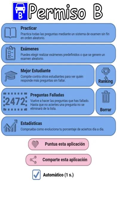 La aplicación tiene más de 4500 preguntas obtenidas de exámenes anteriores de la DGT. Tienes varios modos de aprendizaje: