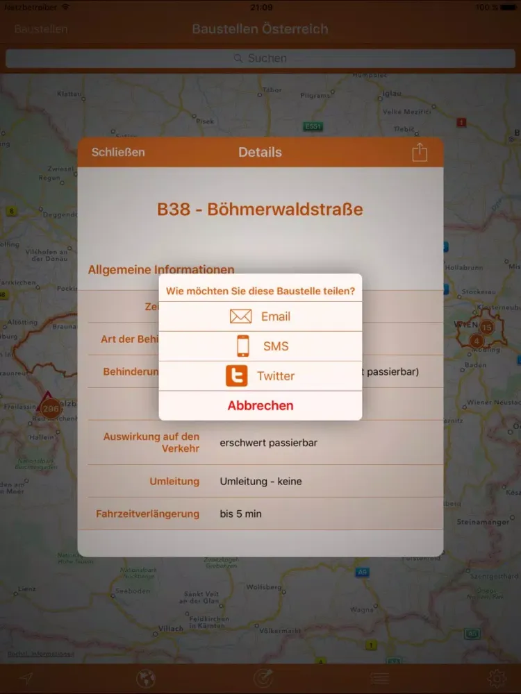 • Teilen der Baustelleninformationen per Emai, SMS und Twitter