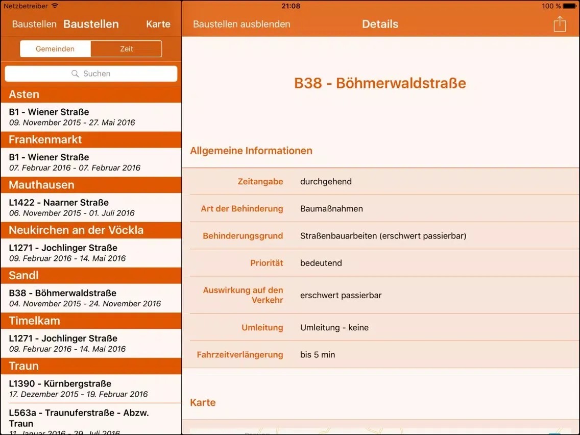 • Anzeige von Detailinformationen, wie dem genauen Zeitraum und dem Grund der Baustelle, sowie Angaben zur Fahrzeitverlängerung, Kontaktadressen der Verantwortlichen und vieles mehr (unterschiedlich je Datenquelle)