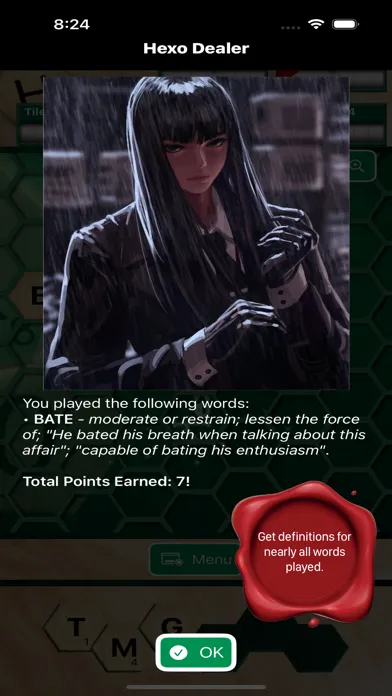 Words and Suits is Hex-n-Spell taken to the next level! Use it's unique blend of letters with the suits from a deck of cards to form two pairs, three of a kind, four of a kind or a full house for up to a 5x word score. Like Hex-n-Spell, overlay existing tiles to form new words and get definitions on all words played*.