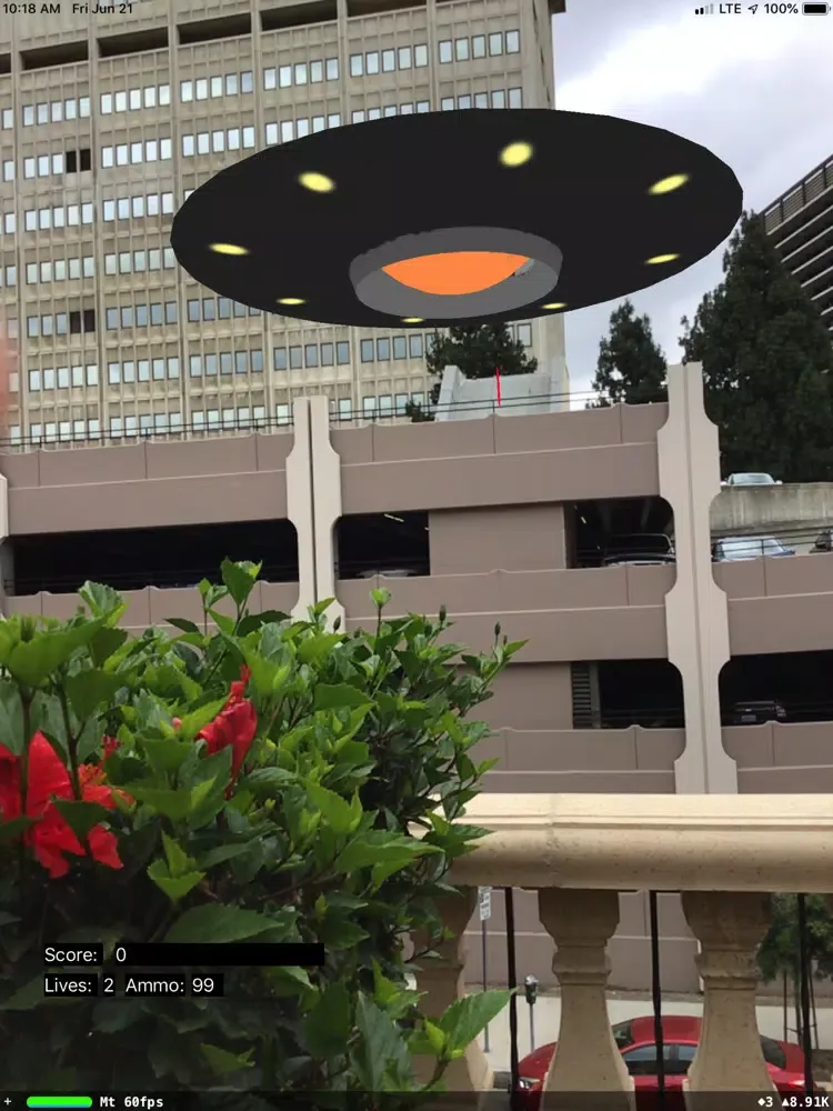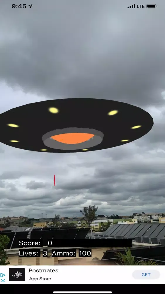 mARs Invader is an Augmented Reality (AR) game app that uses your device's camera and screen to display 'UFOs' invading your city on your device's screen. The goal of the game is to fire upon the UFOs to destroy it, this will earn one point and prompt another UFO. You may purchase extra UFOs with different designs by clicking the 'Extra UFOs' button and then pick UFOs to purchase. To restore all purchases, click 'Restore Purchases'. To add or remove purchased extra UFOs in each game, prior to starting the game press the 'Extra UFOs' button and make sure the switch is on (green) for each extra UFO you want in the game, firing upon one of these extra UFOs will earn ten points. Avoid enemy fire (red lasers) from the UFOs. You only have three lives and 100 ammo for each game then your score restarts to 0, unless you purchase more lives or ammo. Game score or points does not equate to any prize(s) or cash and there is no guarantee that your scores will be saved correctly in the app or Game Center. Please do not play this game or use your device while driving or operating a motor vehicle.