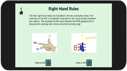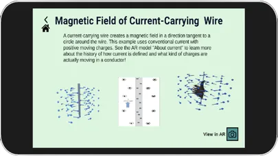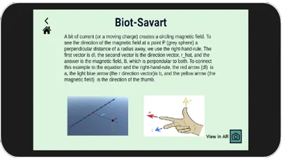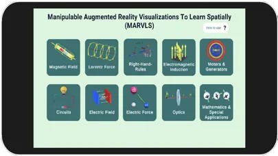 This App provides students with augmented reality visualizations of abstract and 3D concepts in electric fields, magnetism, right-hand-rules, circuits, electromagnets, motors, and generators, optics, 3D integration, nuclear magnetic resonance, and neuroscience. You'll need a Merge Cube ( link included to download from the internet). Click on different button to navigate to different topics. Click on View in AR to view the model. Hold the Merge cube so that your camera can see it well. Move the cube around until you see the model. Click on the buttons to interact with the model. Click the back button to get back to the info screens or to the main screen.