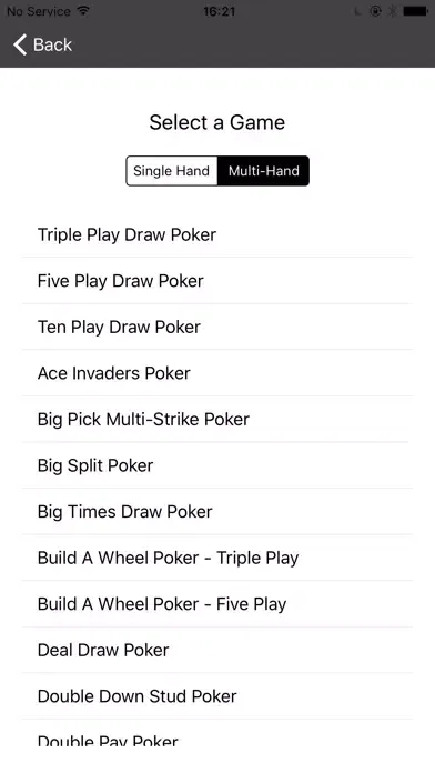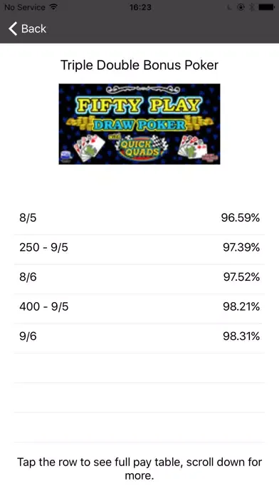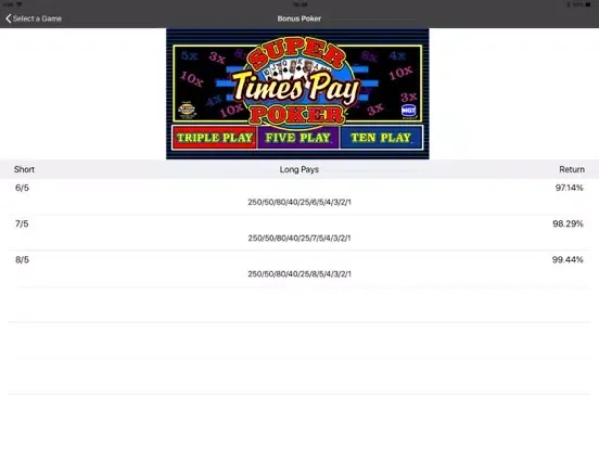 The Video Poker Pay Table app gives you the exact pay back percentages for all the most popular video poker games. This includes single hand games like Jacks or Better and Double Double Bonus as well as all the multi-hand games like Super Times Pay and Spin Poker. You simply select the pay table of the game you’re playing and the app tells you the percentage pay back.