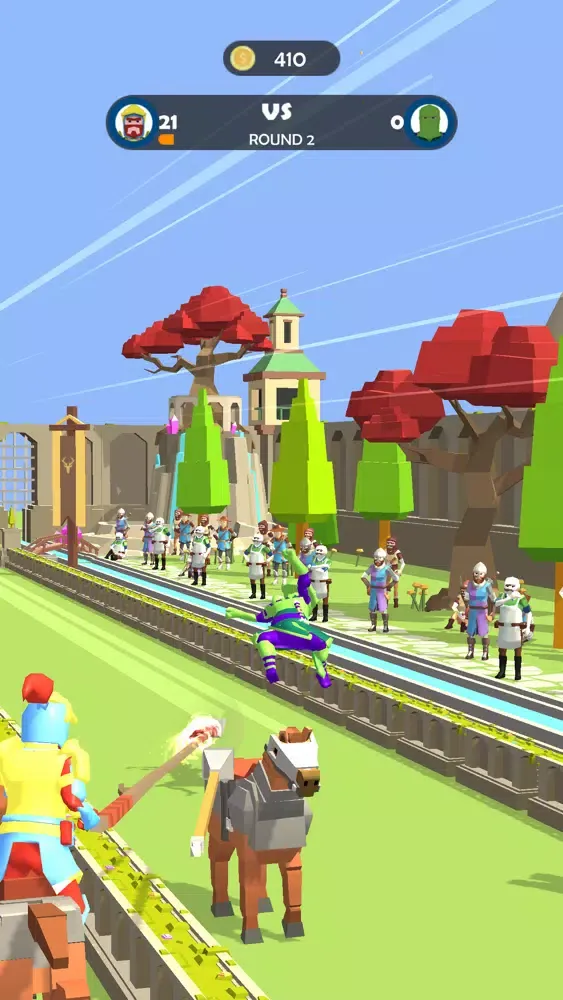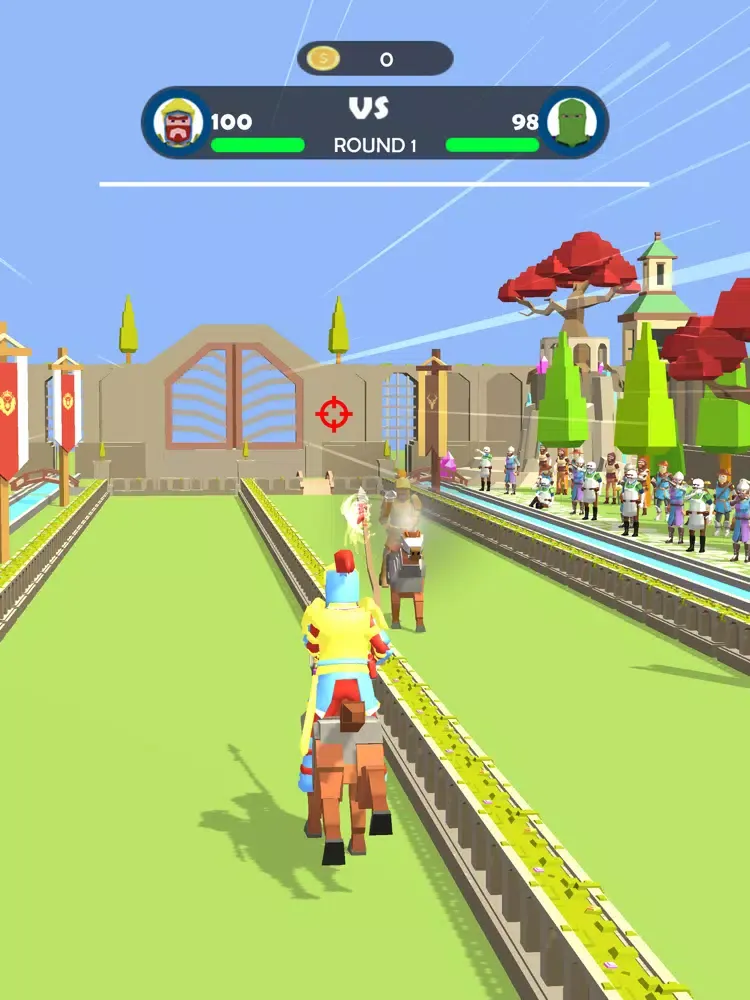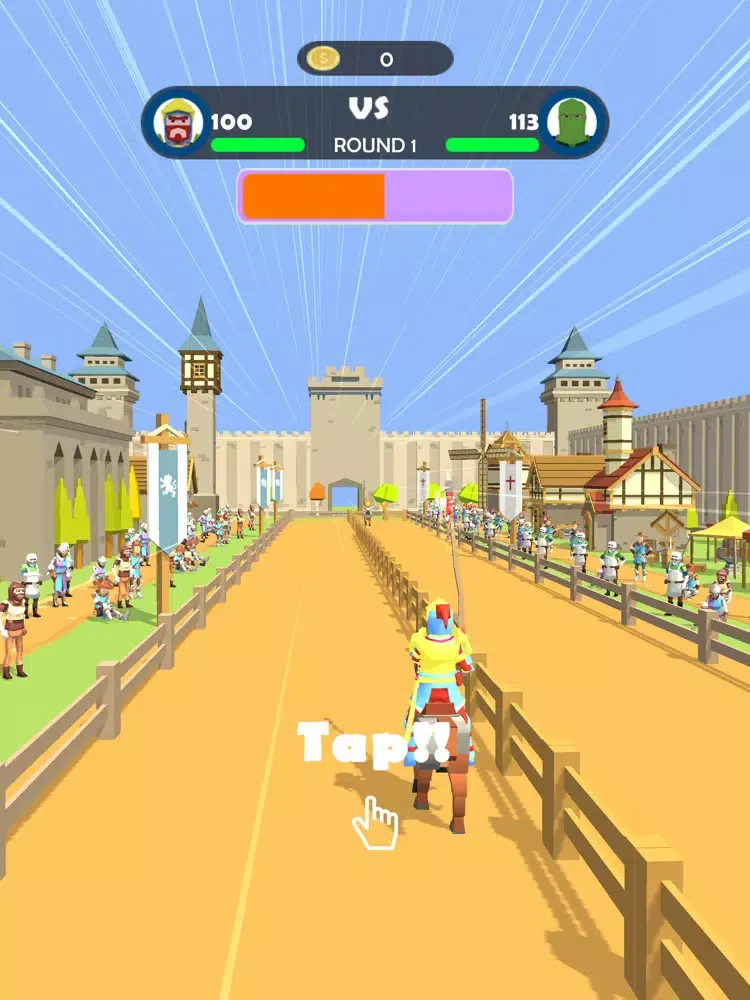 Tap, tap, tap to increase the speed of your horse. Then, you take aim to hit the opponent. First tap to aim horizontally and second tap to aim vertically. Happy Jousting.