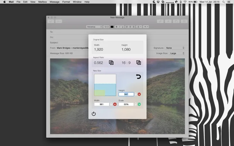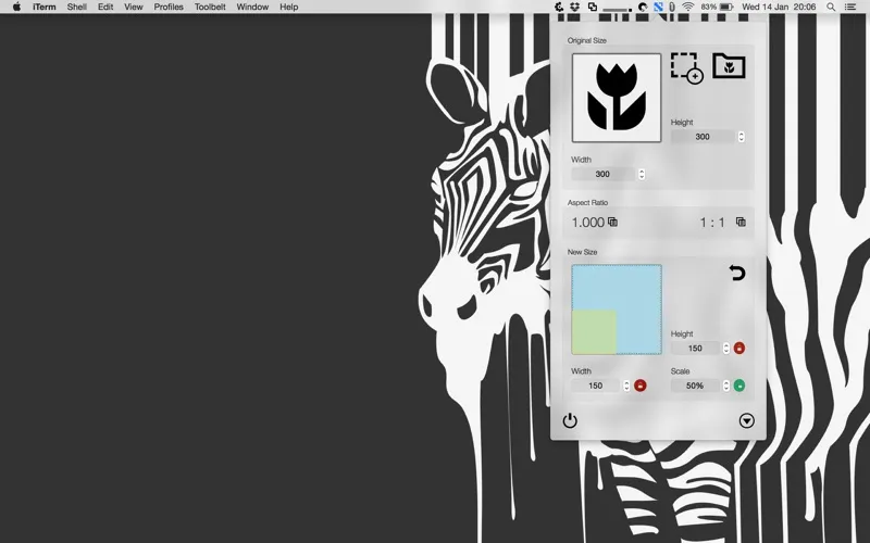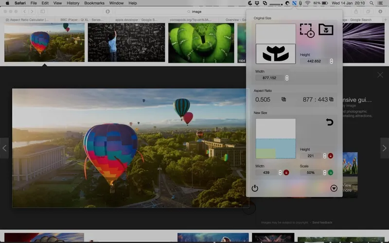 Activate Aspect Ratio Calculator by selecting an image or a portion of your screen and you’ll get the dimensions back along with the aspect ratio calculated. Adjust for your desired output’s width, height or scale and you’ll have the other dimensions adjusted to match and maintain the proportions of the original size.