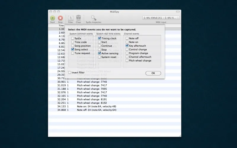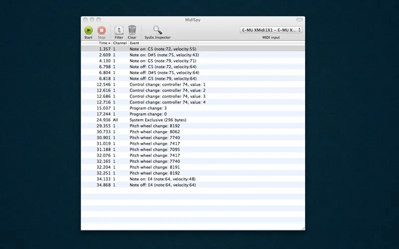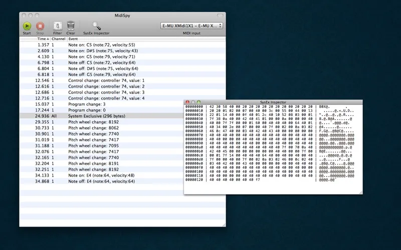 MidiSpy is a MIDI input logging utility. It enables you to capture all incoming MIDI events so that you can discover how your MIDI device is communicating. You can also use it to view the contents of SysEx messages.