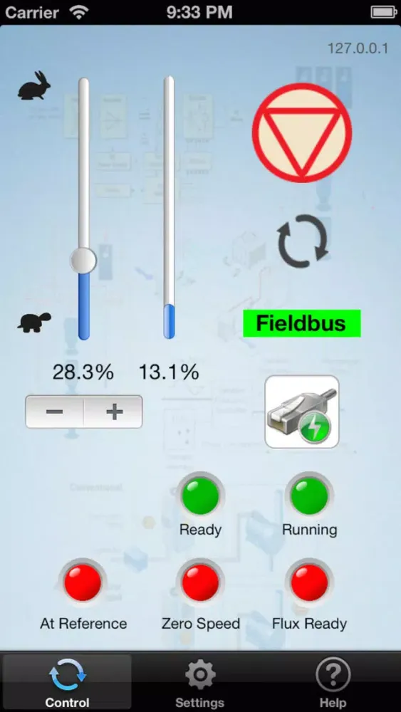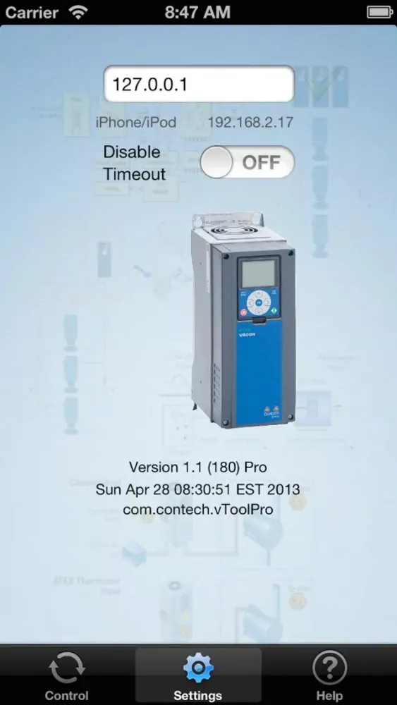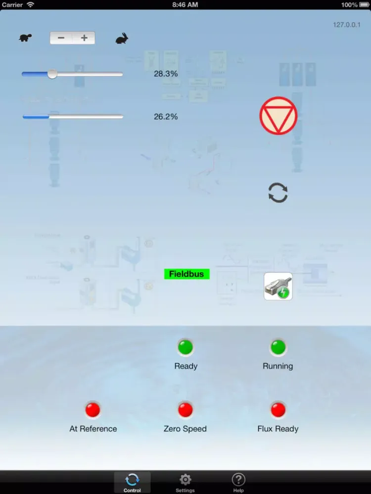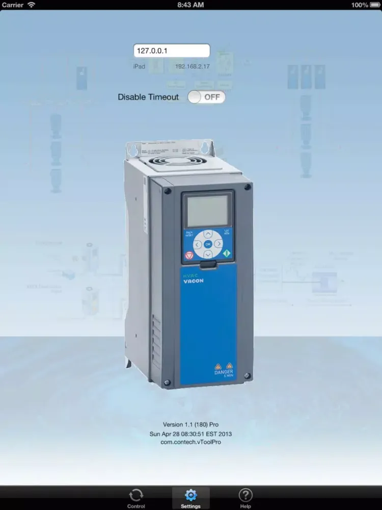 Control Vacon 100 Variable Speed Drive. Uses ModbusTCP protocol (built into every Vacon 100) to connect to the Drive using the Wifi network. It displays status, ready, direction, fault and alarm information from the drive and allows the user to start/stop the drive and control drive speed and direction.