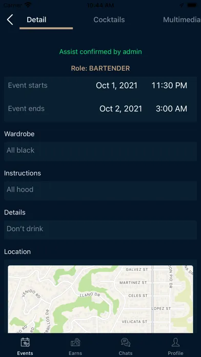 √ Details of the event with a map and how to get there, a list of cocktails to be prepared and a small social network to share photos and videos of the event.