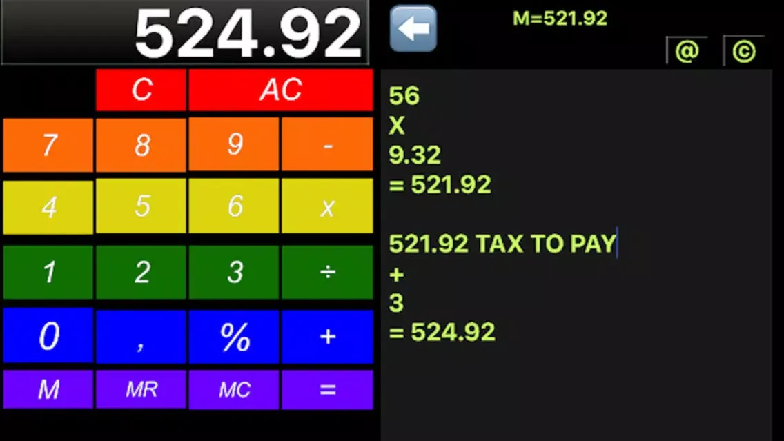 Calculator with memory functions, percentage, delete function and more.