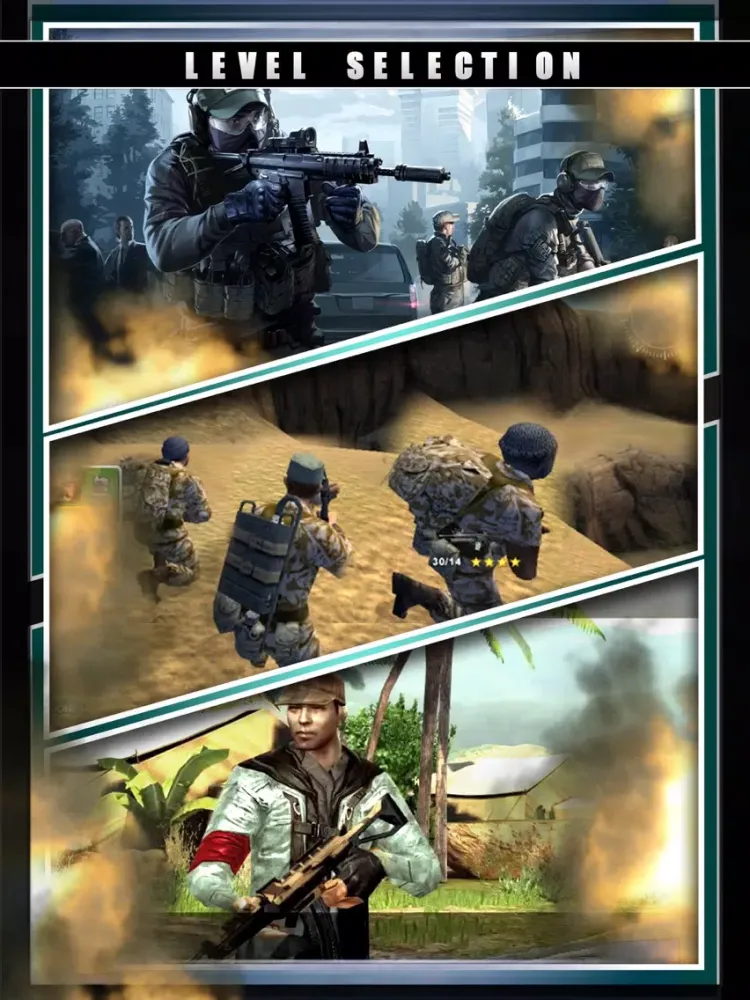 There are multi combat in 3 amazing screen map! Desert Military Base, Black Forest spy war and urban City. dangerous terrorists attack on Military Base! Be careful. There are many remnants of terrorist,enemies kill you when they know your position. you should must kill all enemies to win freedom.