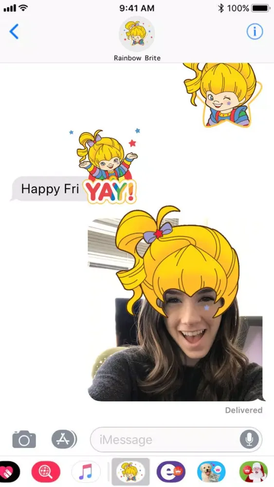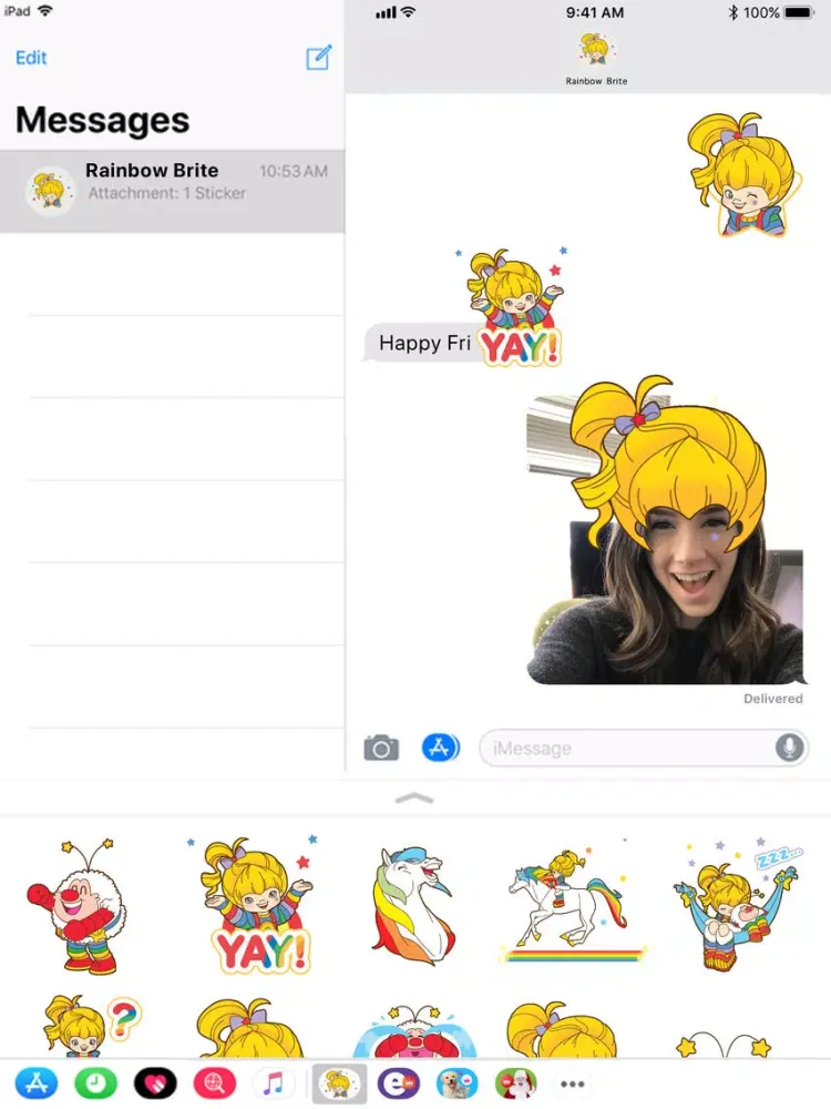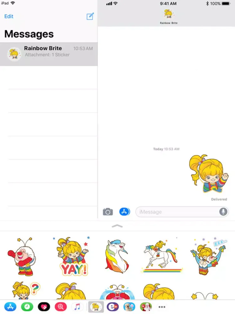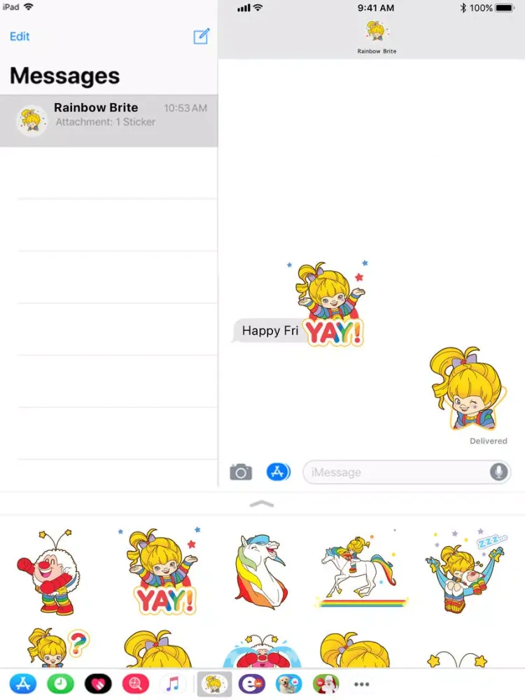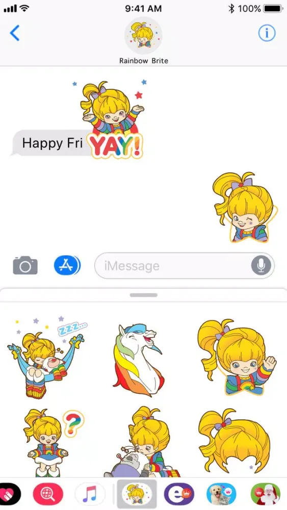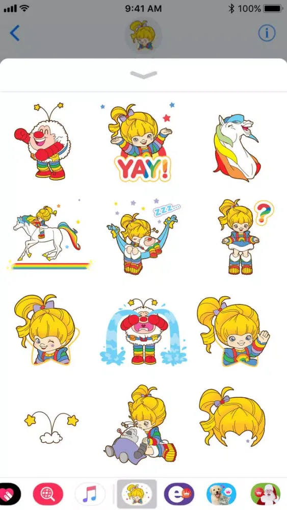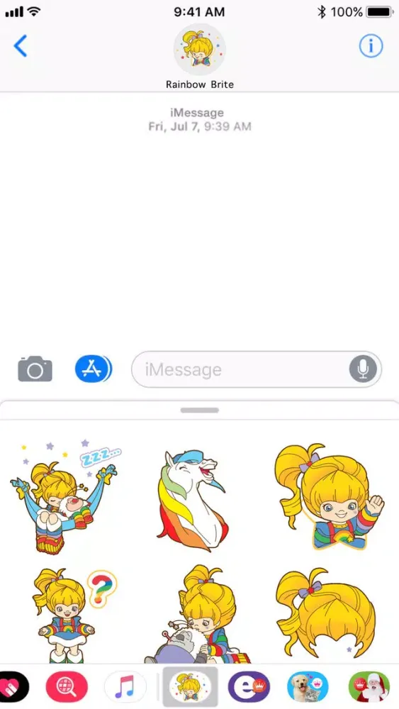 These are easy to use: simply tap the arrow to the left of the text field, tap the app icon, click on the four dots in the bottom left corner, find your Rainbow Brite sticker pack, and add them to any of your iMessages.