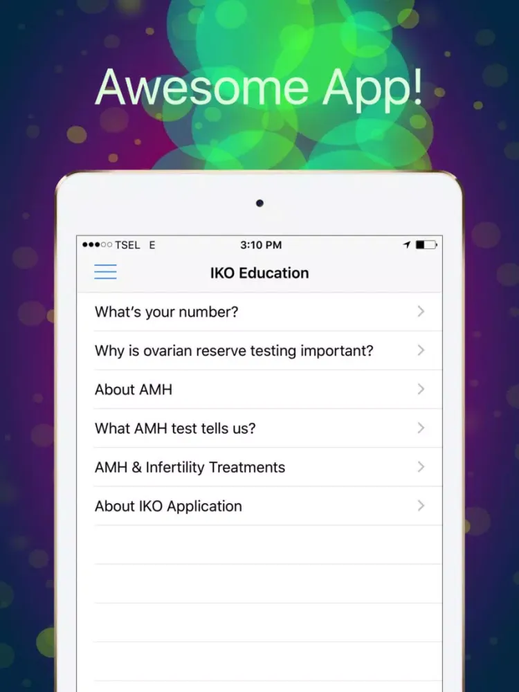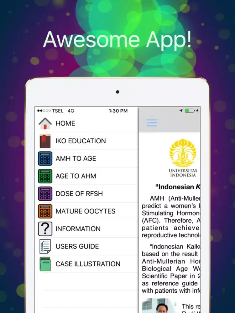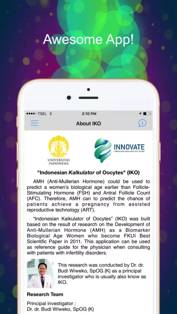 “Indonesian Kalkulator of Oocytes” (IKO) was built based on the result of research on the Development of Anti-Mullerian Hormon (AMH) as a Biomaker Biological Age Women who become FKUI Best Scientific Paper in 2011. This application can be used as reference guide for the physician when consulting with patients with infertility disorders.