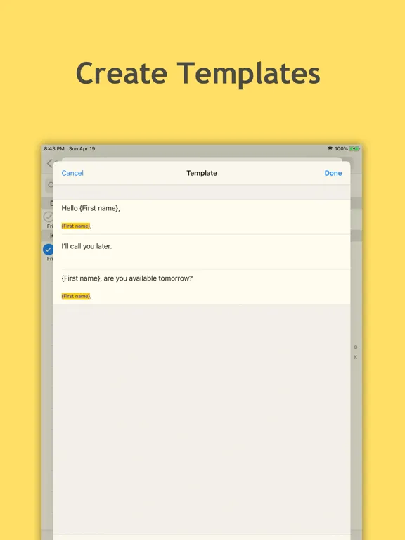 Create text and email templates and add placeholders to them. The templates can later be used to sending group text and email.