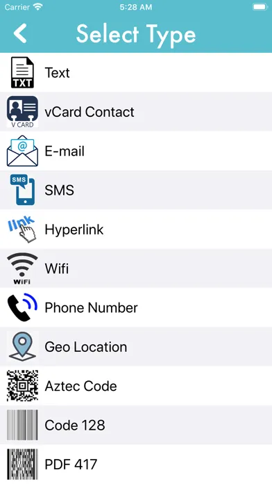 Supported code types for scanning and reading: QR, Aztec, Code 128, Code 39, Code 39 Mod 43, Code93, Data Matrix, EAN-13, EAN-8, Interleaved 2 of 5, ITF-14, Pdf 417, UPC-E.