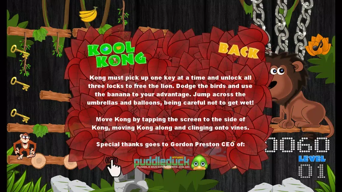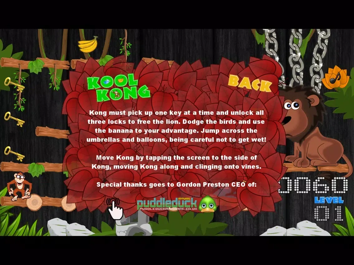 Controls are simple. To move Kong, just tap the screen left, right, down or above where you want to move Kong... as long as there isn't any logs in the way. The birds will block you and you could end up getting wet, if you fail to negotiate the umbrellas and balloons.